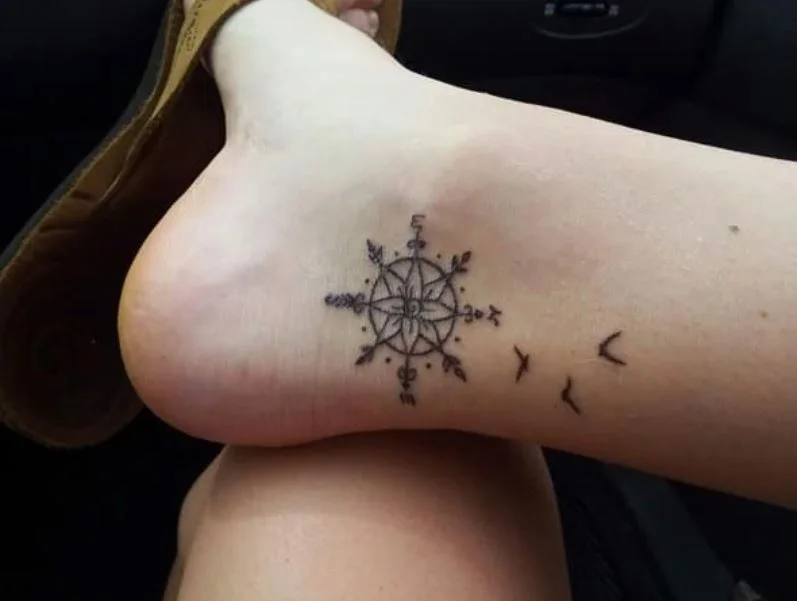 Admirez la délicatesse de ce tatouage minimaliste de boussole sur le pied avec ces oiseaux qui volent au-dessus. Quelle créativité !