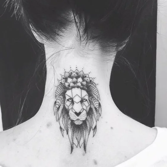 Un beau dessin ornemental composé de lion et mandalas sur la nuque.